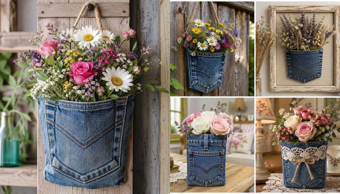 A flower arrangement made from a jeans pocket proves that creative decoration does not need expensive supplies. Sometimes the best ideas are already sitting in a drawer, waiting to be reimagined.