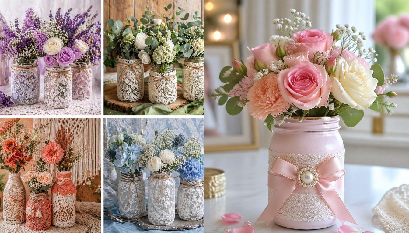 Mixing burlap with lace is very popular. It combines rustic and elegant elements. These burlap and lace jar designs are great for country-themed events and farmhouse homes.