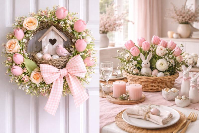Pastel pink Easter decorations are perfect for Easter. This color is cheerful and welcoming. Start with egg displays in glass bowls or vintage wire baskets.